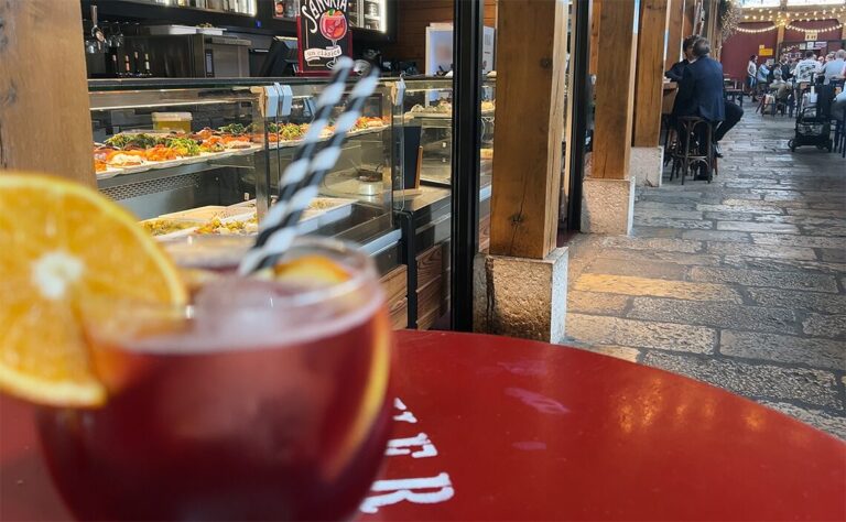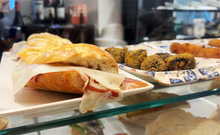 マリア・ピタ広場の露店でバーベキューソースたっぷりのローストポークサンドイッチ(Bocadillo de carne asada/ボカディージョ・デ・カルネ・アサーダ)とコーラ。