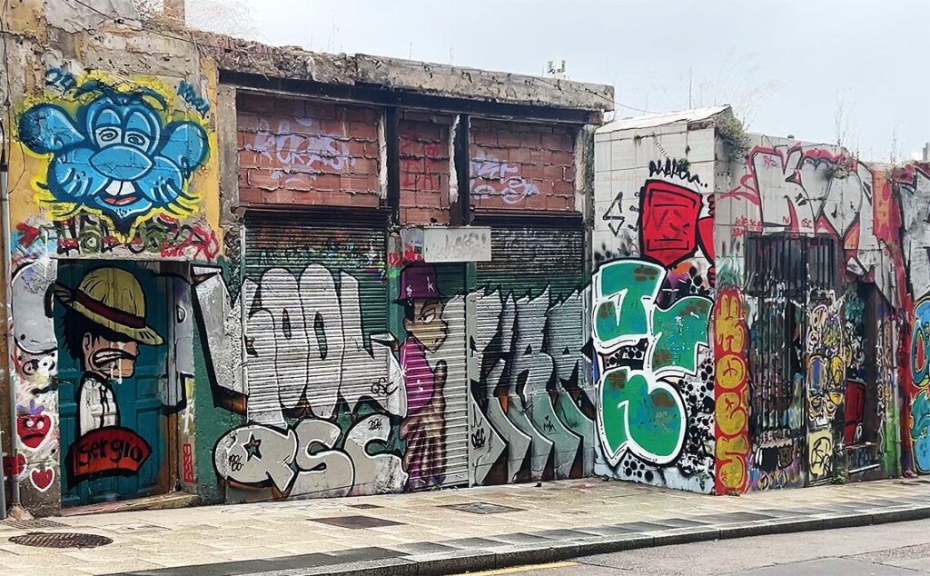 大都市では落書きが集中する傾向がある。マドリードやバルセロナの旧市街、グラナダのアルバイシン地区では、路地裏や建物の側面に落書きが多い。観光地に近い場所でも、日本人の感覚からするとかなり多く、壁のいたるところにタグやスローガンが見られる。観光客の目に触れる壁も、スペインでは文化やアートの一部として許容されていることが多く、管理されていない場所では自由に描かれているのが現実だ。