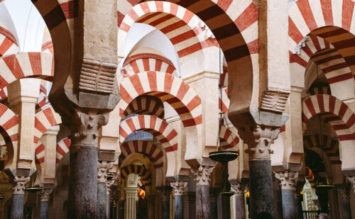 コルドバの大モスクは、イスラム建築の傑作として知られる。785年に建設が始まり、その後200年以上にわたって増築が続けられた。内部には850本以上の円柱が林立し、赤と白の縞模様のアーチが幾重にも連なる。この建物は後にキリスト教会に改造されたが、イスラム時代の構造の多くが保存されている。